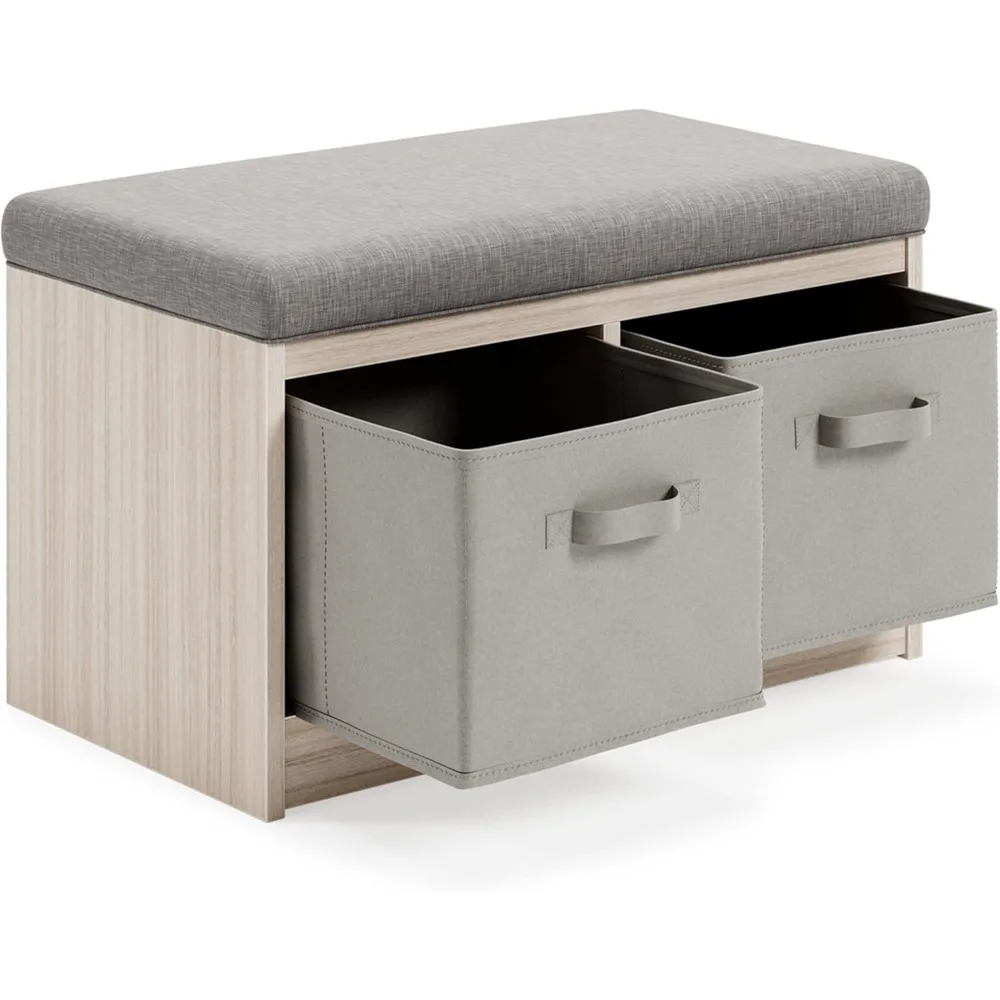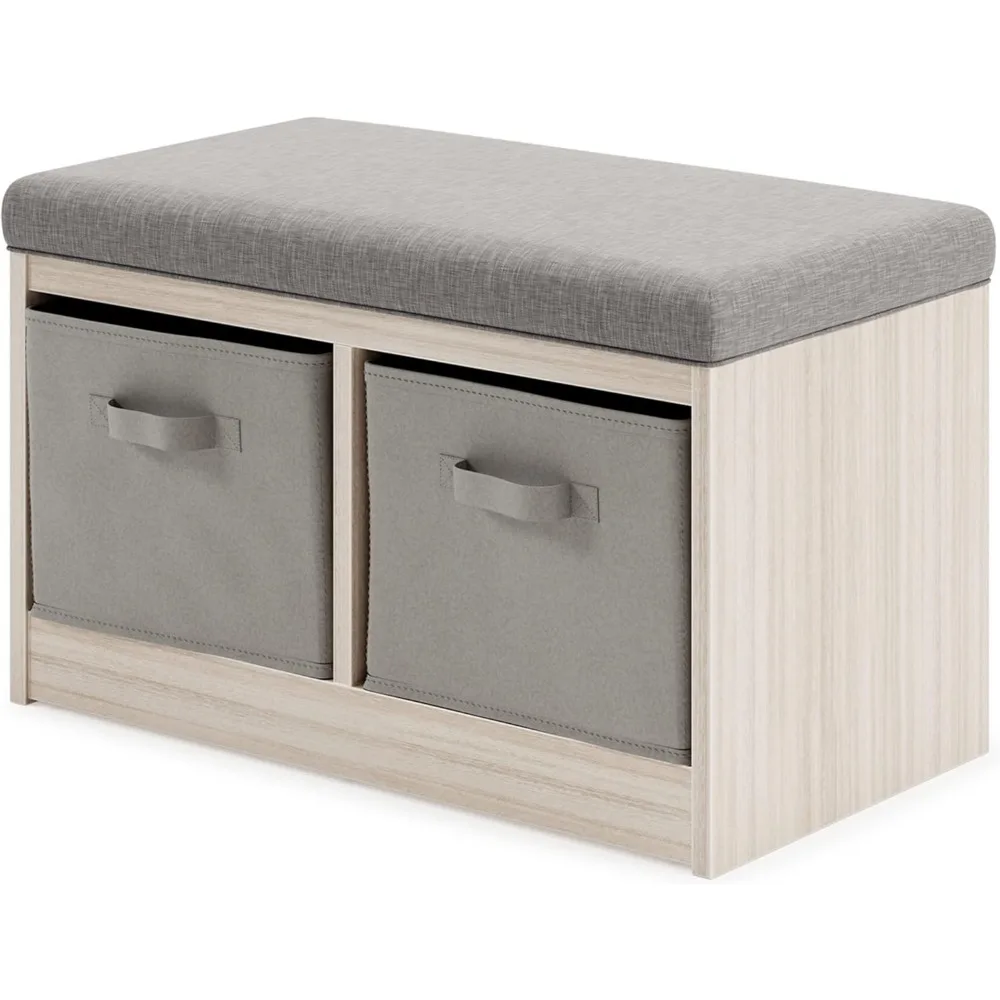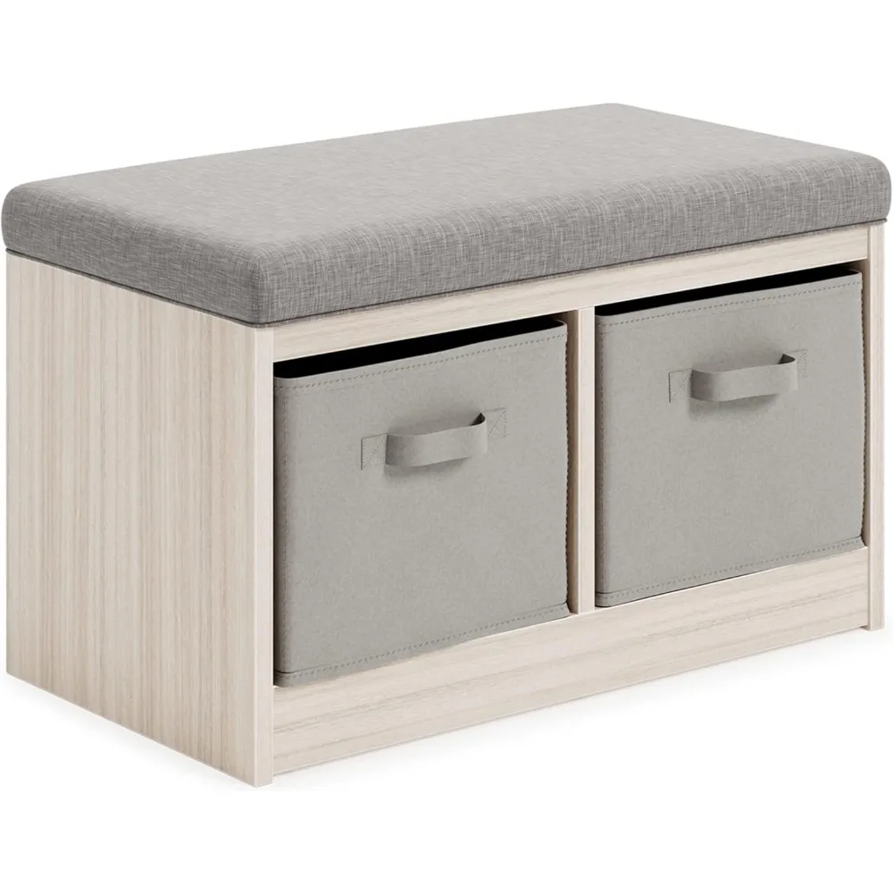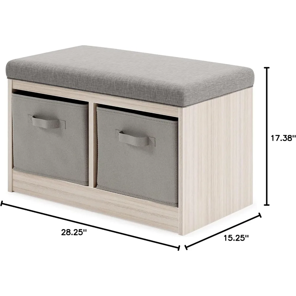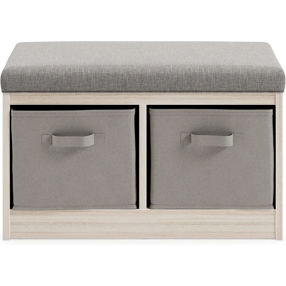 - HANDSOMELY CRAFTED: Made of veneer and engineered wood with a reversible polyester upholstered cushion and 2 open bins each with cloth basket cube